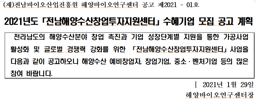 2021 전남해양수산창업투자지원센터 수혜기업 모집 공고 계획(안).hwp
