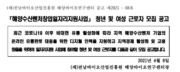 해양수산벤처창업일자리지원사업 청년 및 여성근로자 모집 공고