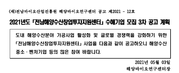 2021년도「전남해양수산창업투자지원센터」수혜기업 모집 3차 공고 계획
