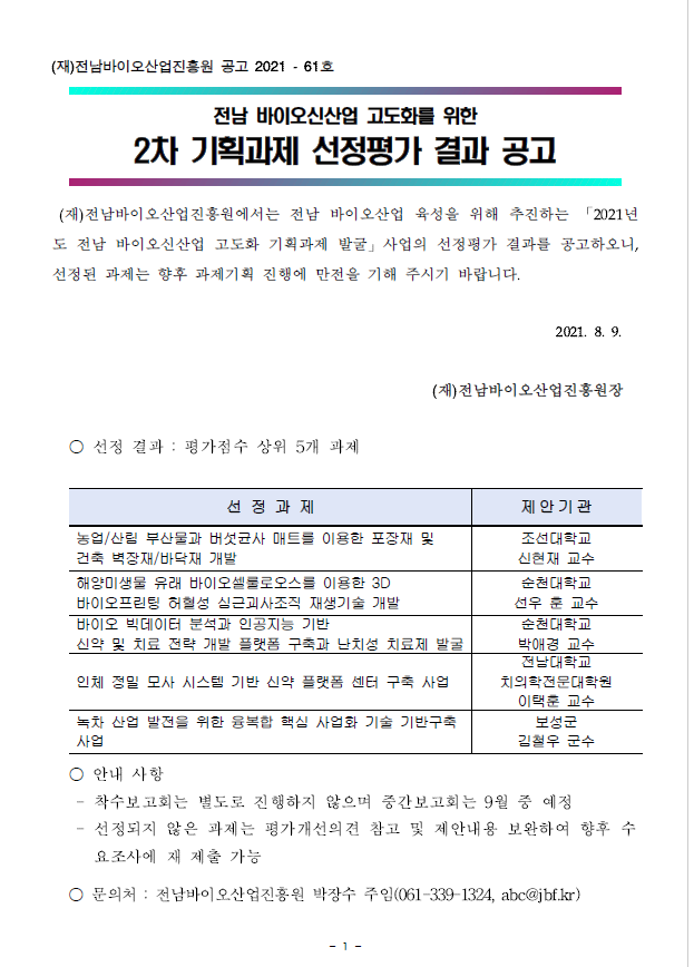 전남 바이오신산업 고도화 2차 기획과제 선정평가 결과공고