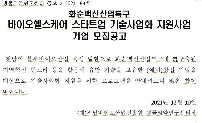 바이오헬스케어스타트업 기술사업화지원사업(2021년) 수혜기업 추가모집 재공고