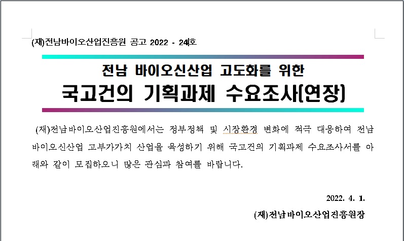 전남 바이오신산업 고도화를 위한 국고건의 기획과제 수요조사 연장 공고