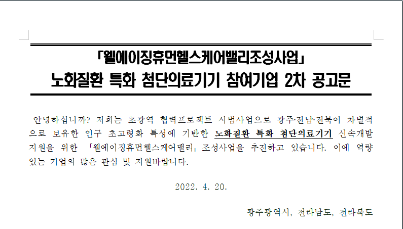 웰에이징휴면헬스케어밸리조성사업 참여기업 2차 공고문