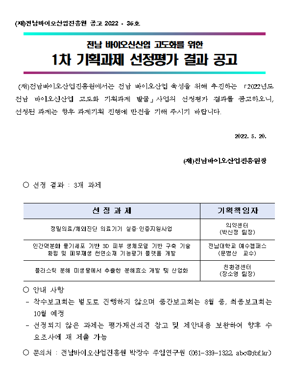 2022년 바이오신산업 고도화 1차 기획과제 선정평가 결과 공고