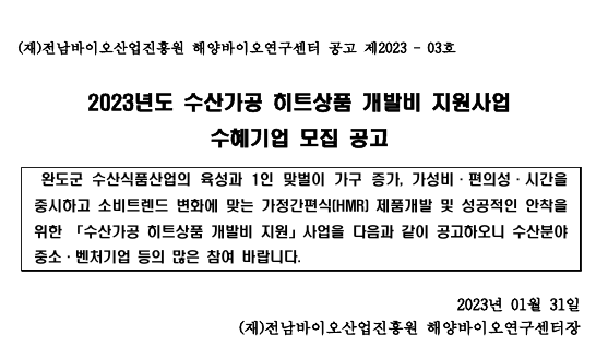 2023년도 수산가공 히트상품 개발비 지원사업 수혜기업 모집 공고