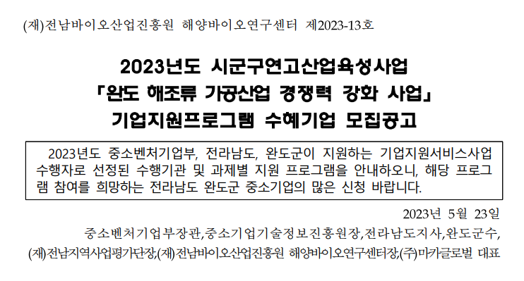 2023년도 시군구연고산업육성사업 「완도 해조류 가공산업 경쟁력 강화 사업」 기업지원프로그램 수혜기업 모집공고
