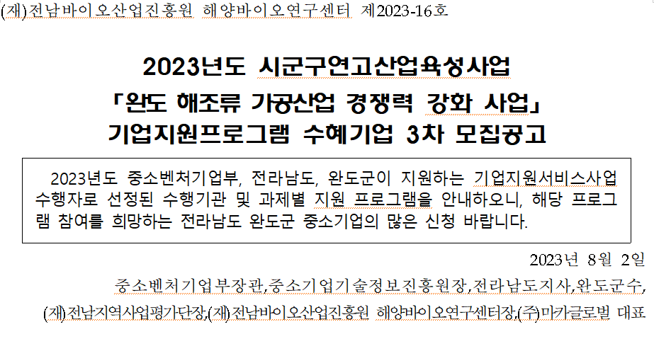 2023년도 시군구연고산업육성사업 「완도 해조류 가공산업 경쟁력 강화 사업」 기업지원프로그램 수혜기업 3차 모집공고