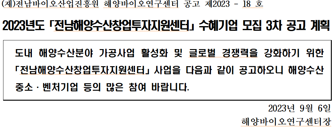 2023 전남해양수산창업투자지원센터 수혜기업 모집 3차 공고 계획(안).hwp