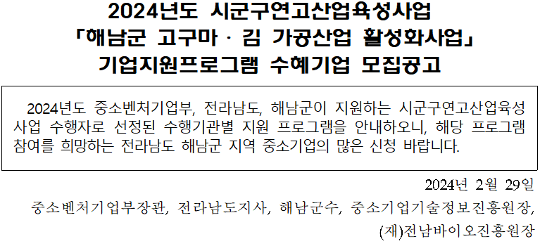 2024년도 시군구연고산업육성사업 「해남군 고구마 ‧ 김 가공산업 활성화사업」 기업지원프로그램 수혜기업 모집공고