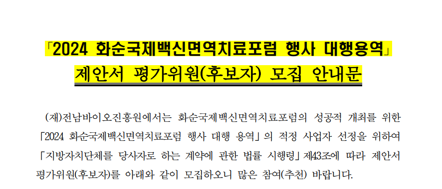 [사업공고] `2024 화순국제백신면역치료포럼 행사 대행 용역` 제안서 평가위원(후보자) 모집 공고