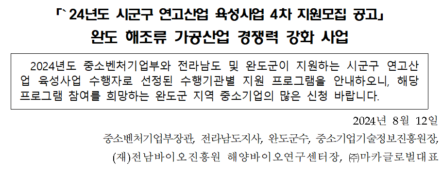 「`24년도 시군구 연고산업 육성사업 4차 지원모집 공고」 완도 해조류 가공산업 경쟁력 강화 사업