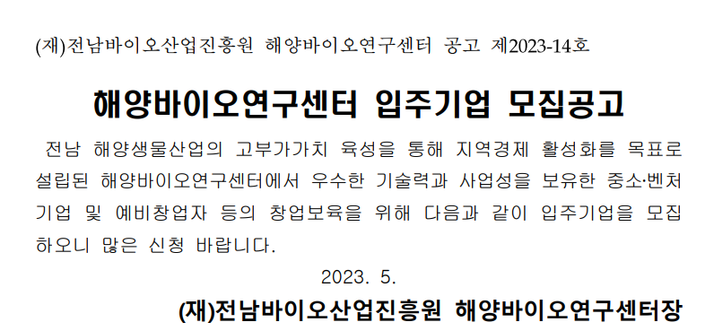 2023년도 제2차 해양바이오연구센터 입주기업 모집공고