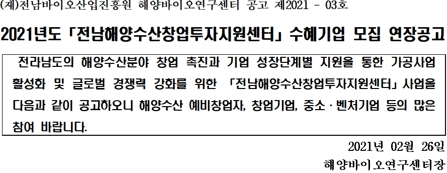 [사업공고] 2021년도「전남해양수산창업투자지원센터」수혜기업 모집 연장공고