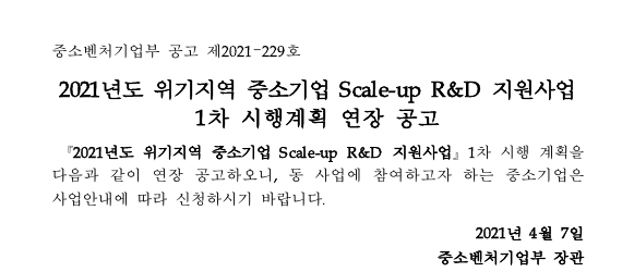 [사업공고] 2021년도 위기지역 중소기업 Scale-up R&D 지원사업 1차 시행계획 연장 공고