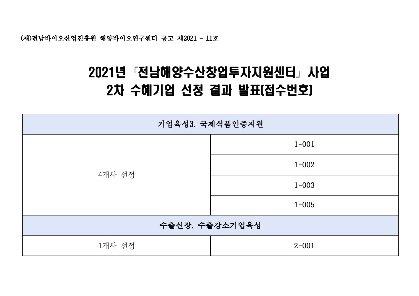 [사업공고] 2021년 전남해양수산창업투자지원센터 사업 2차 수혜기업 선정 결과 발표(접수번호)
