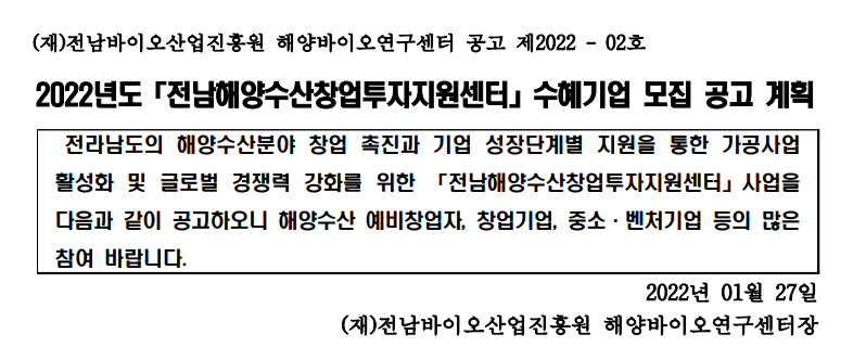 [사업공고] 2022년도「전남해양수산창업투자지원센터」수혜기업 모집 공고