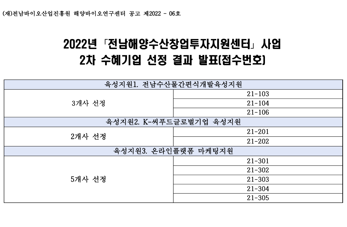 2022년 전남해양수산창업투자지센터 사업 2차 수혜기업 선정 결과 발표(접수번호)