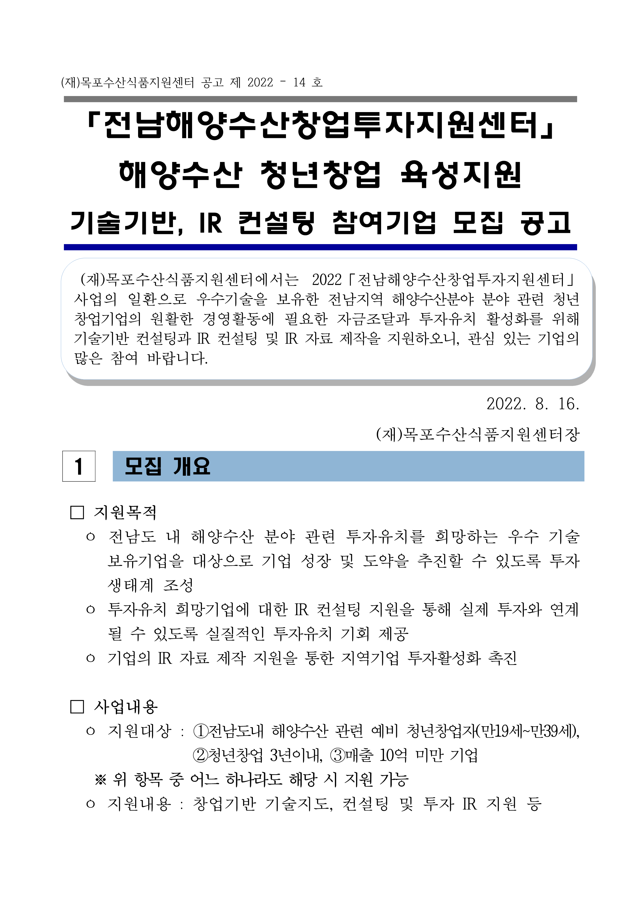 「전남해양수산창업투자지원센터」 해양수산 청년창업 육성지원 기술기반, IR 컨설팅 참여기업 모집 공고