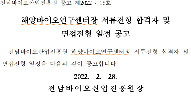 해양바이오연구센터장 서류전형 결과 및 면접일정 공고