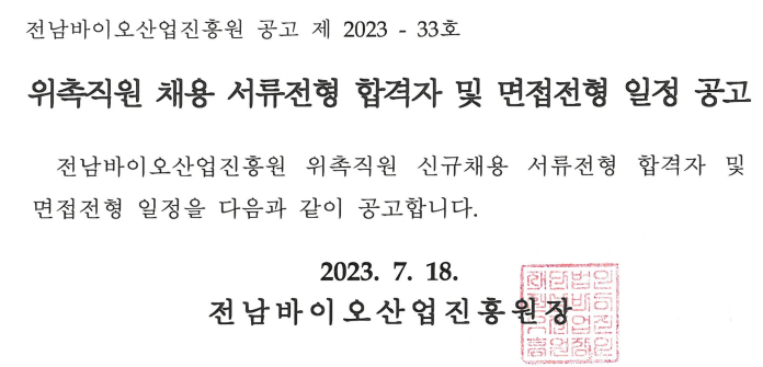 2023년도 3분기 위촉직원 채용 서류전형 합격자 및 면접전형 일정 공고