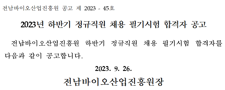 2023년도 하반기(통합채용) 정규직 필기시험 합격자 공고
