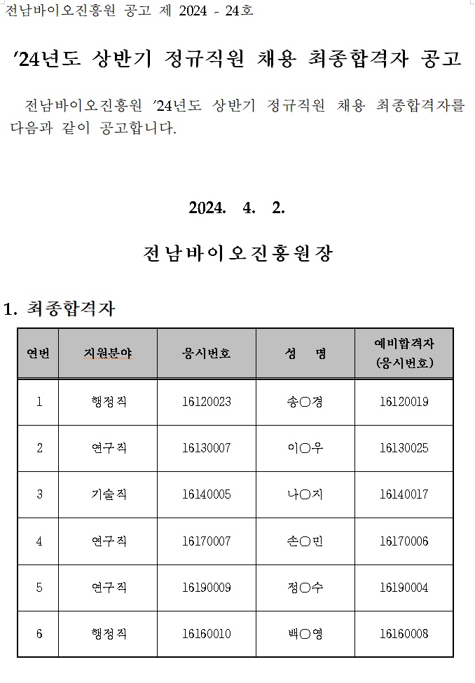 24년도 상반기 정규직원채용 최종 합격자 공고