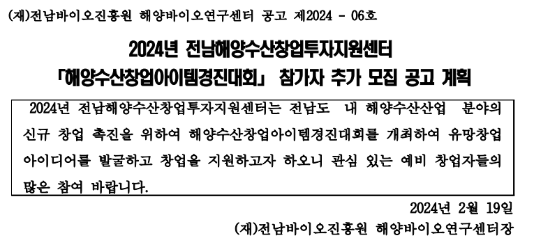 2024년 전남해양수산창업투자지원센터 「해양수산창업아이템경진대회」 참가자 추가 모집 공고 계획