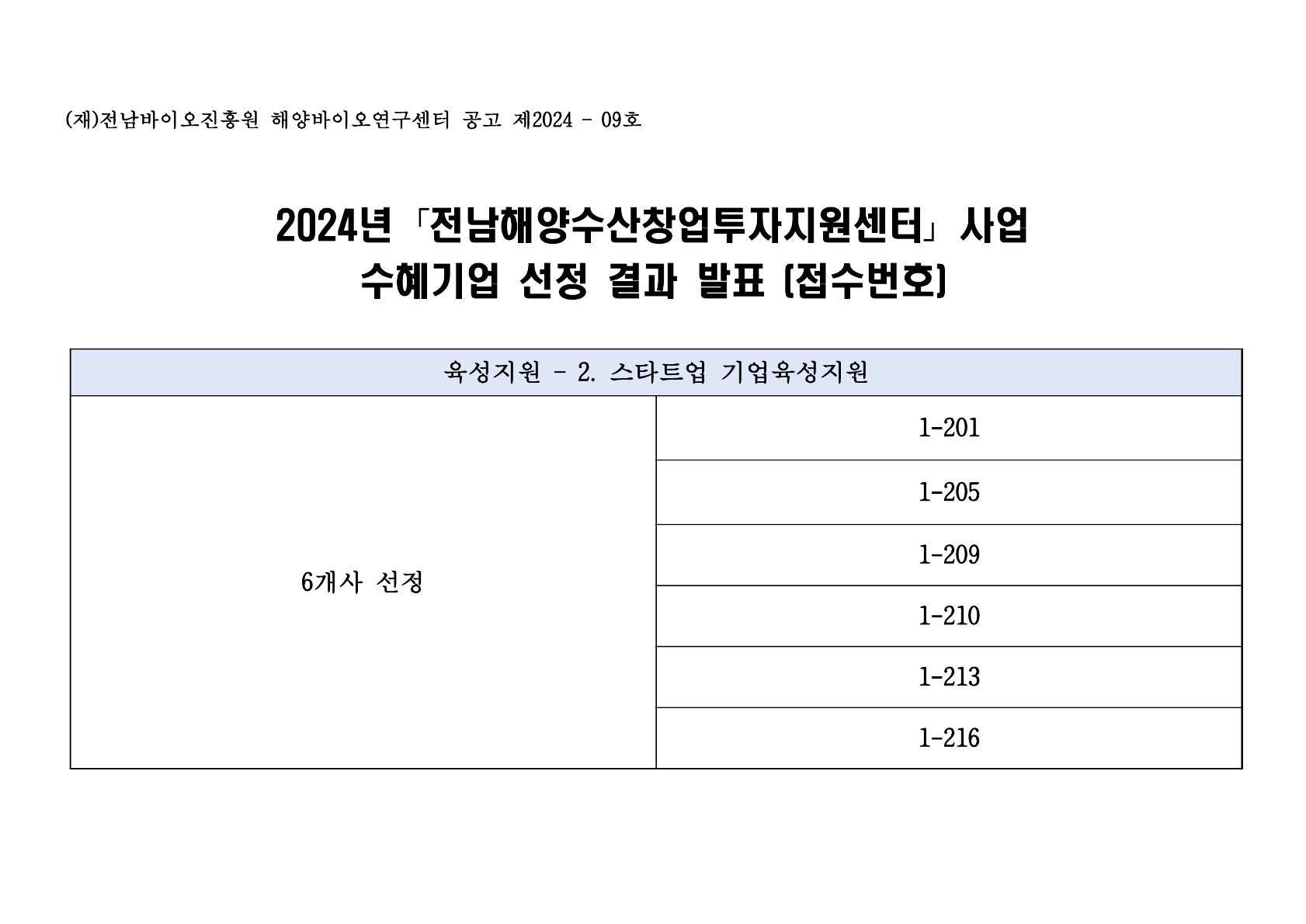 2024년 전남해양수산창업투자지원센터 사업 수혜기업 선정 결과 발표(접수번호)