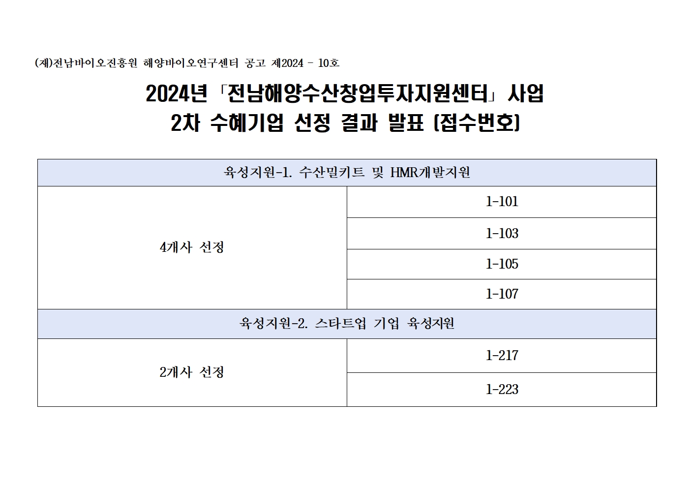 2024년 「전남해양수산창업투자지원센터」 사업 2차 수혜기업 선정 결과 발표 (접수번호)