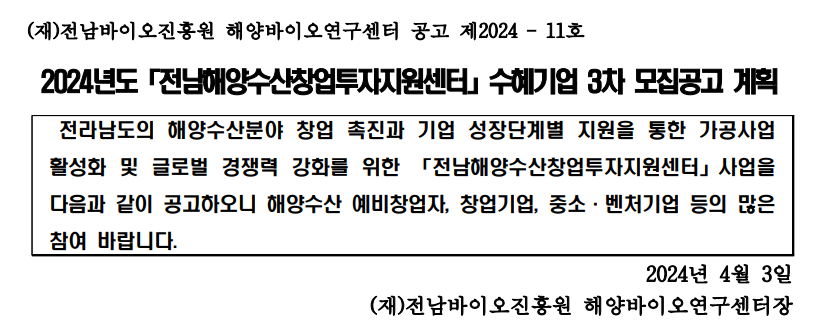 [사업공고] 2024년도「전남해양수산창업투자지원센터」수혜기업 3차 모집공고