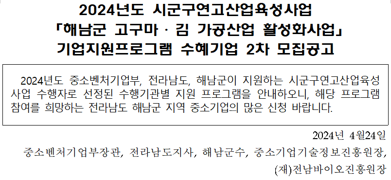 [사업공고] 「해남군 고구마 ‧ 김 가공산업 활성화사업」 기업지원프로그램 수혜기업 2차 모집공고