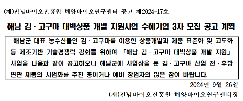 2024 해남 김.고구마 대박상품 개발지원 사업 수혜기업 3차 모집공고 계획안.hwp