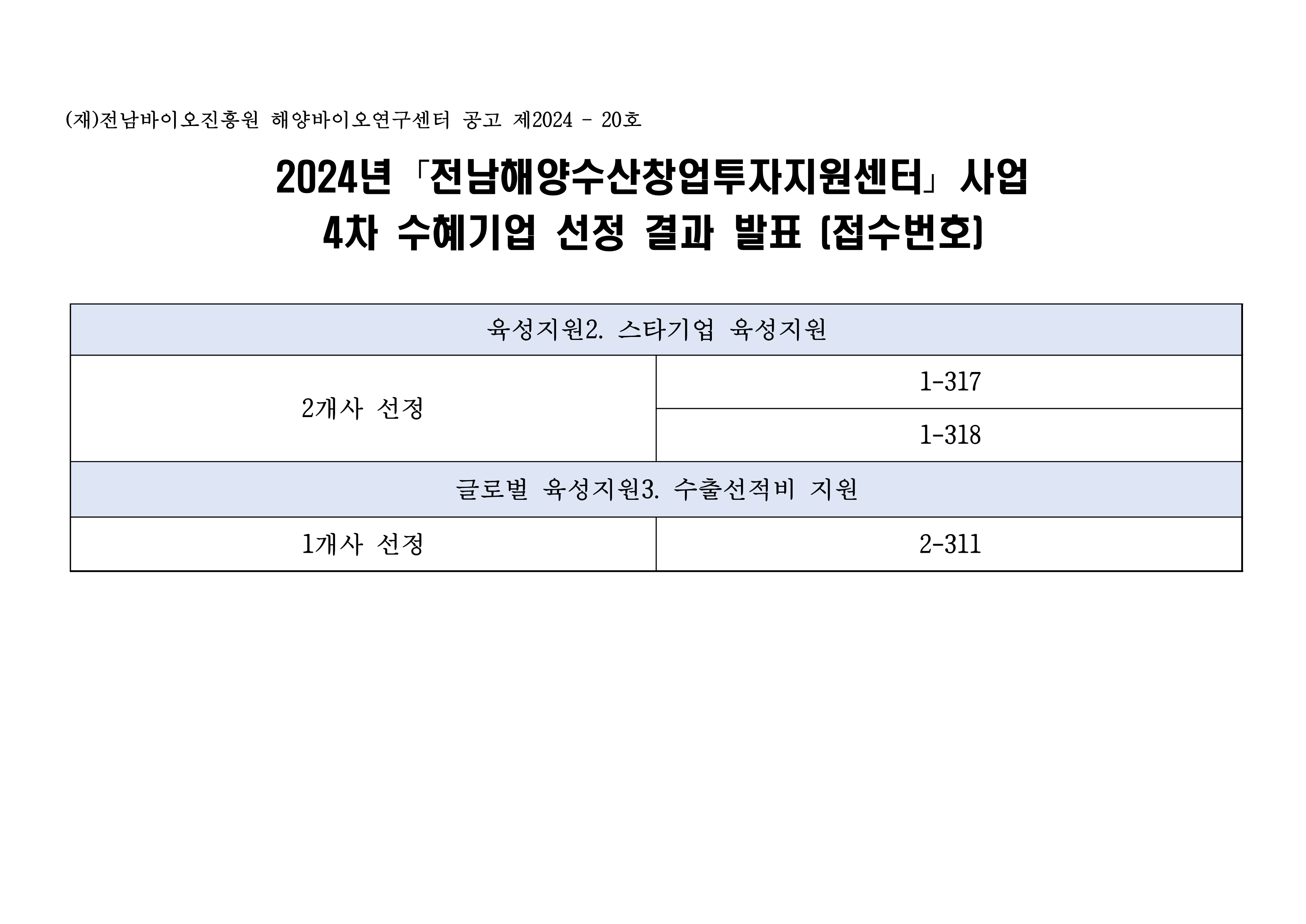 2024년 「전남해양수산창업투자지원센터」 사업 4차 수혜기업 선정 결과 발표 (접수번호)