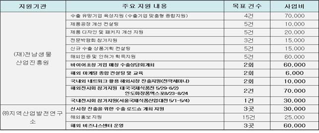 특히, 해외바이어 초청 수출상담회의 경우 한날 한 장소에서 많은 기업제품에대해 상담회하는 것을 지양하고, 바이어가 관심기업에 직접 방문하여 제품생산현장과 동시에 전남의 맑은 공기, 푸른 숲, 황토 땅, 깨끗한 바다 등을 직접보고 느끼고 부데 끼도록 프로그램을 진행할 계획이다. 이와 같은 바이어 초청 행사가 수출계약으로 이어지게 하기 위해서는 미리 지역기업으로부터 상품소개서를 받아 중국어, 영어, 일본어로 번역한 다음 바이어 풀에 뿌린 다음 관심 품목이 있는 바이어 만 선별적으로 수출상담회에 참여케 할 계획이다.