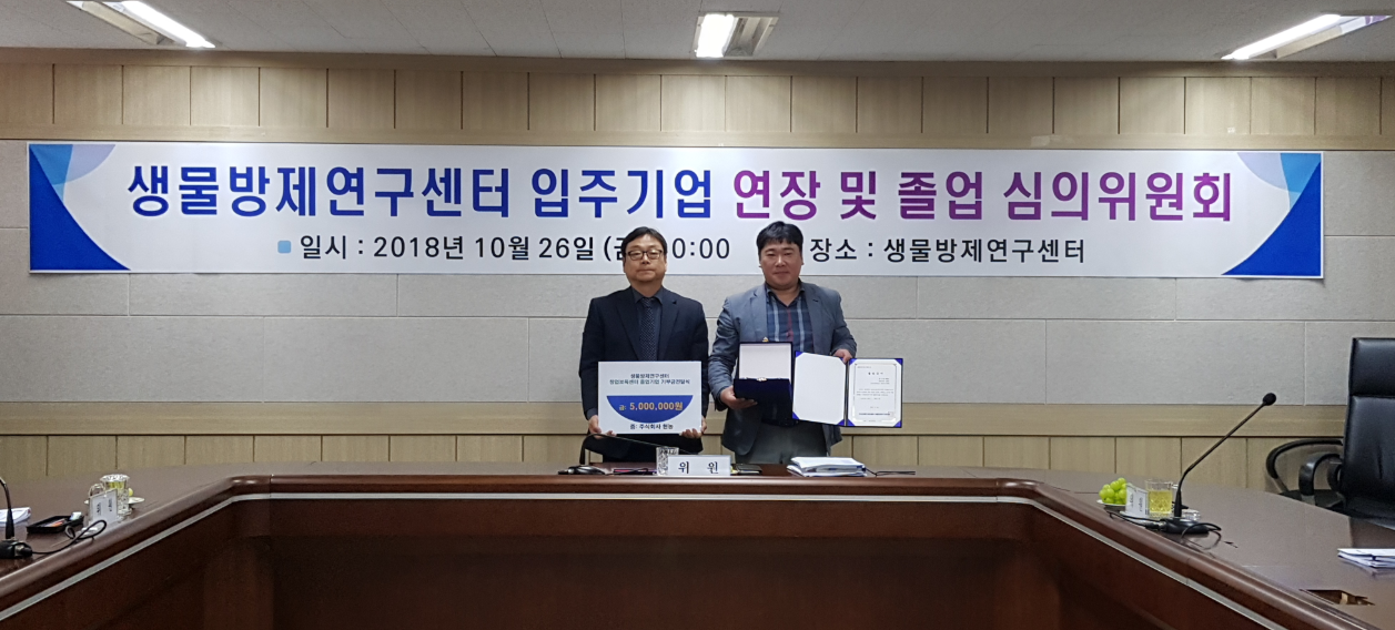 한편, 지난26일 졸업기업 졸업증서 수여식에서 김철홍대표는 “방제센터에 입주기회를 주셔서 감사하고 특히 창업초기 공동기술개발 과제 수행에 있어 많은 도움을 준 생물방제센터 관계자분들의 관심과 배려에 감사드리며, 입주기업으로서 긍지와 자부를 느끼며 더욱 노력하여 성공으로 보답하겠다”며 발전기금으로 500만원을 기부했으며 창업보육센터에 7년 동안 입주하면서 모범 기업으로 지역사회에 귀감이 되는 성장과 발전을 해왔다.