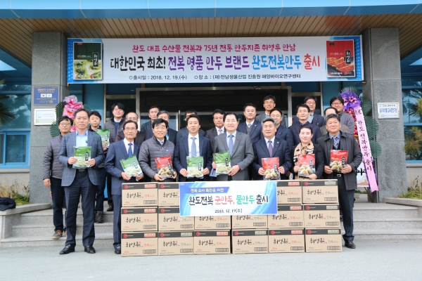 (재)전남생물산업진흥원 해양바이오연구센터(센터장 임영태)과 완도군은 ㈜취영루(대표이사 신정호)와 함께 국내 최초 전복을 활용한 완도전복만두 2종을 공동 개발해 출시했다.
