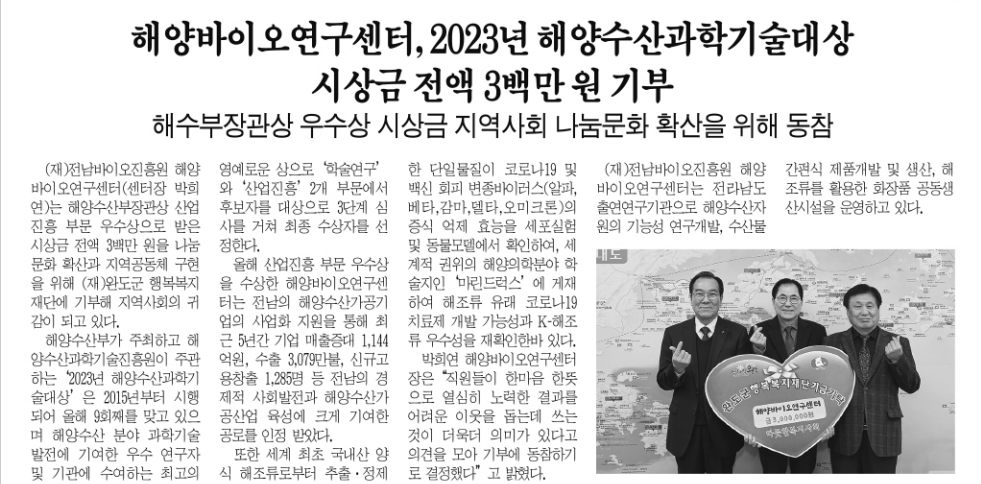 [완도타임스] 해양바이오연구센터, 2023년 해양수산과학기술대상 시상금 전액 3백만원 기부