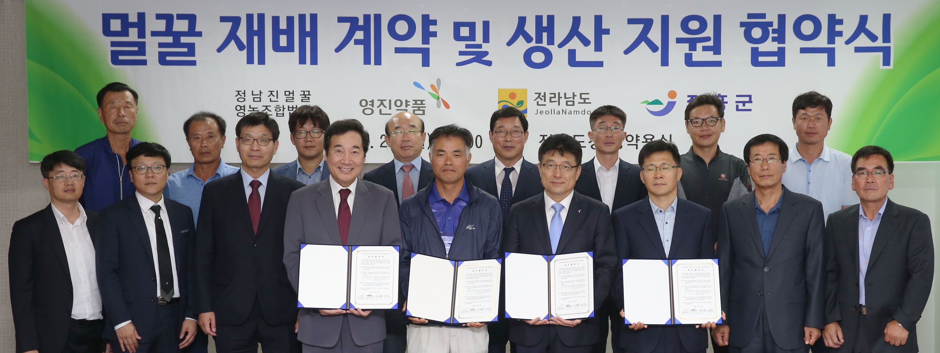 참석자 : 안기홍 원장(2열 가운데), 이낙연 전남지사(1열 왼쪽부터), 유재열 멀꿀영농조합 대표, 박수준 영진약품 사장, 서은수 장흥부군수